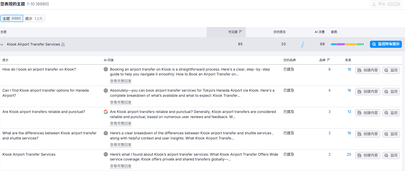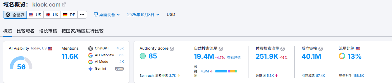 除了品牌流量klook占比较大以外,klook通过博客页面获得关键词排名较多, 博客页面在GEO的表现确实更佳。