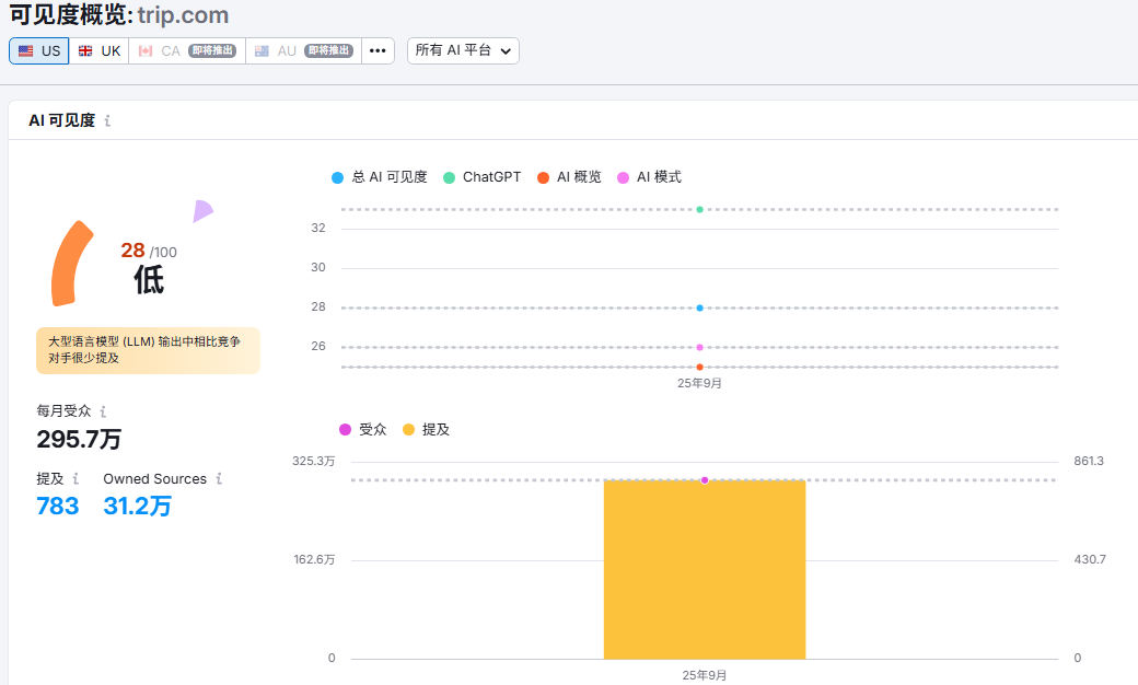 进一步看一下两个网站在semrush平台的AI SEO中AI可见度表现情况: