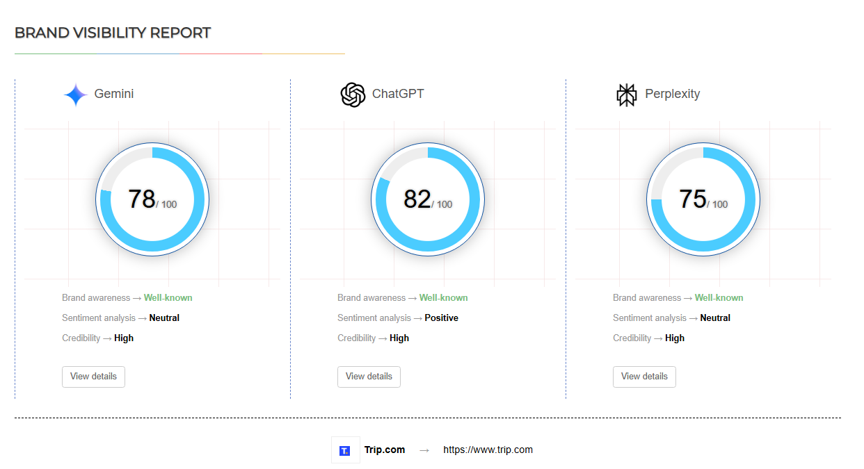 继续,我们再通过第三方工具看一下这两个网站在Genimi, Perplexity和ChatGPT的GEO表现: