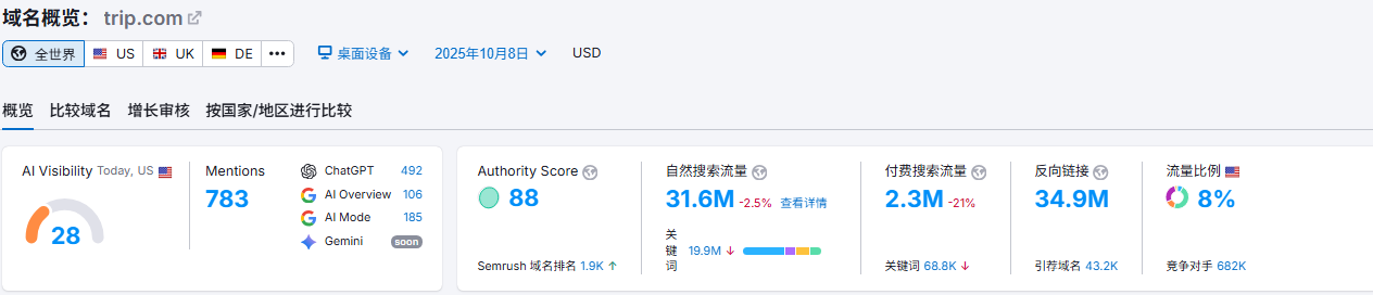 trip.com是中国大陆携程的网站,klook.com是香港的公司,这两个网站都是国内领先的旅游体验预定平台。今天,我们从SEO/GEO优化的角度来简单分析一下两个站点。